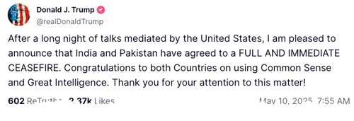 "After a long night of talks mediated by the United States, I am pleased to announce that India and Pakistan have agreed to a FULL AND IMMEDIATE CEASEFIRE," Trump said.