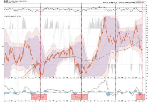 This isn’t the first time the “dollar’s death” has made the news. In 2022, “de-dollarization” narratives filled the bearish narratives, with everyone saying the dollar’s death was imminent. Yet, that “frenzy of doom” marked the bottom of the dollar before a robust rally. We could be setting up for another similar rally for two reasons.
