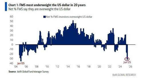 Furthermore, everyone from the “shoe-shine boy to the street corner vendor” is shorting the dollar. According to BofA’s fund manager survey, the short position against the US Dollar is at the highest level in 20 years. As such, any reversal in the dollar could be substantial if those “shorts” are forced to reverse their positions.
