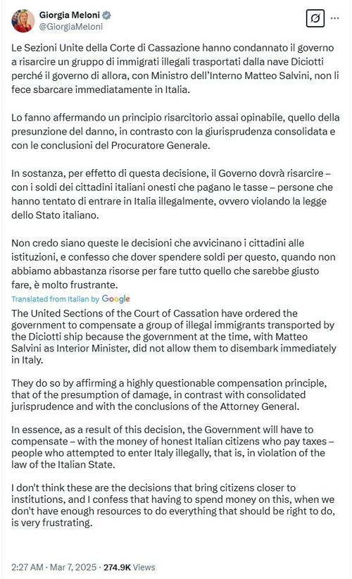 “As a result of this decision, the government will have to compensate — with the money of honest Italian citizens who pay taxes — people who have attempted to enter Italy illegally, that is, by violating the law of the Italian state,” Meloni said in a post on X.
