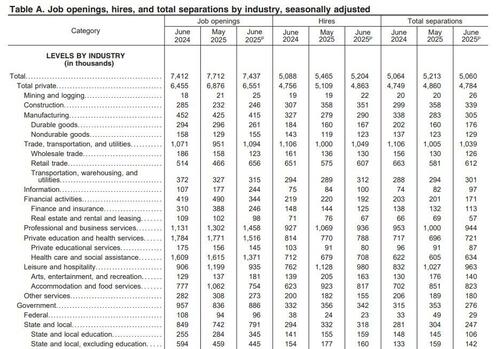 After several consecutive stronger then expected job openings reports and one month after the JOLTS report showed an unexpected surge in job vacancies, moments ago the BLS said that in June (with its usual one month lag, coming just days before the July nonfarm payrolls report), job openings in the US dropped to a lower than expected 7.437 million, down 275K from 7.712 million in May, and below the 7.5 million estimate.