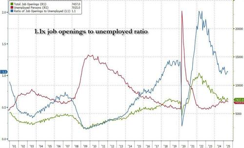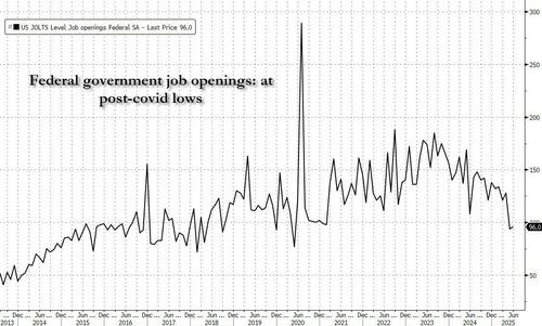 A testament to (what's left of DOGE), is that Federal job openings remained near the post-covid cycle lows, rising just 2k from 94K to 96K.