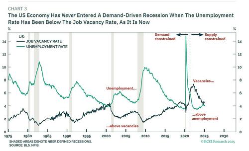 As noted previously, until this number turns negative – which it almost did but may have now averted for the foreseeable future – the US labor market is not demand constrained, and a recession has never started in a period when there were more job openings than unemployed workers.