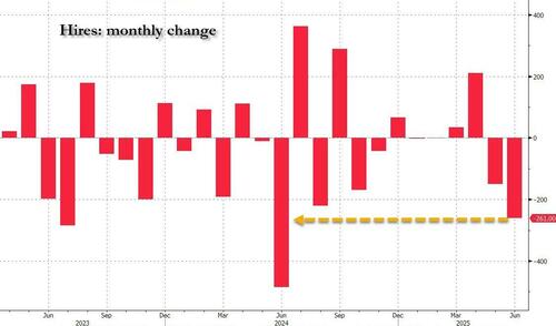 While the job openings data was in line - the drop was to be expected and the miss was modest - it was far uglier on the hiring side where the number of new hires unexpectedly plunged by 261K...