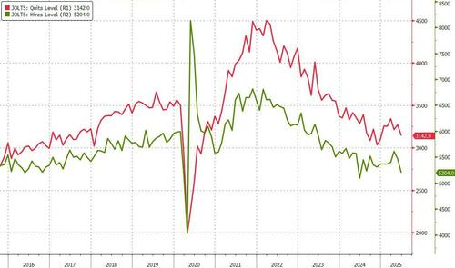 … to just 5.204 million, the lowest in a year, and the second lowest since covid, raising questions about the stability of the US labor market. Meanwhile, the number of workers quitting their jobs – a sign of confidence in finding a better paying job elsewhere – also unexpectedly slumped by 128K to 3.142 million, also one of the lowest prints since Covid.