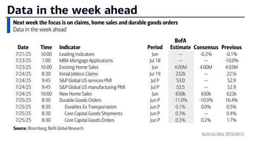 - 08:30 AM Durable goods orders, June preliminary (GS -9.0%, consensus -10.8%, last +16.4%); Durable goods orders ex-transportation, June preliminary (GS -0.1%, consensus +0.1%, last +0.5%); Core capital goods orders, June preliminary (GS -0.2%, consensus +0.2%, last +1.7%); Core capital goods shipments, June preliminary (GS +0.3%, consensus +0.2%, last +0.4%): We estimate that durable goods orders retrenched 9% in the preliminary June report (month-over-month, seasonally adjusted), reflecting a partial normalization in commercial aircraft orders after last month’s spike. We forecast a 0.2% decline in core capital goods orders—reflecting contractionary new orders readings for manufacturing surveys in June and payback for the prior month’s outsized increase—and a 0.3% increase in core capital goods shipments—reflecting the increase in orders over the prior month.