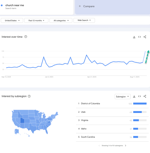 Google Search trends confirm Kolvet's claim, with searches "How to start a Turning Point chapter" erupting, along with, and not surprisingly, "Church Near Me"...