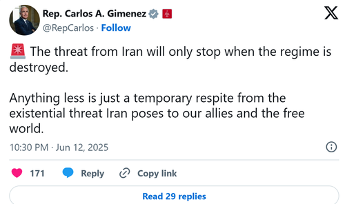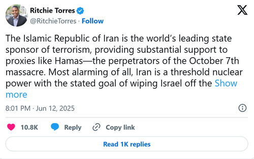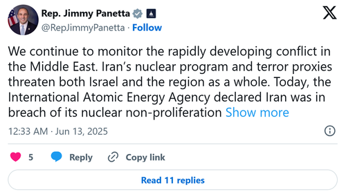 Many US lawmakers claimed that Israel’s preemptive attack on Iran was an act of defense. “Make no mistake: Israel is not the aggressor. It is defending itself against an existential threat that long predates the present preemptive strike. The true aggressor is the Islamic Republic and its empire of terror—an empire stained with the blood of innocent Israelis,” New York Democrat Ritchie Torres wrote on X.