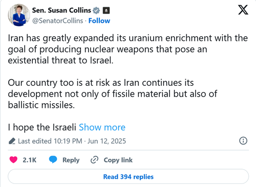 “Iran has greatly expanded its uranium enrichment with the goal of producing nuclear weapons that pose an existential threat to Israel,” Maine Republican Senator Susan Collins wrote. “Our country too is at risk as Iran continues its development not only of fissile material but also of ballistic missiles. I hope the Israeli operation to eliminate Iran’s nuclear capability is successful.”