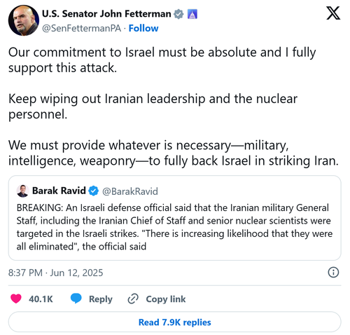 One of the most vocal Democrats supporting Israel is Sen. John Fetterman, who demanded that the White House aid the Israeli assault. “Our commitment to Israel must be absolute and I fully support this attack. Keep wiping out Iranian leadership and the nuclear personnel.” The post continued, “We must provide whatever is necessary – military, intelligence, weaponry – to fully back Israel in striking Iran.”