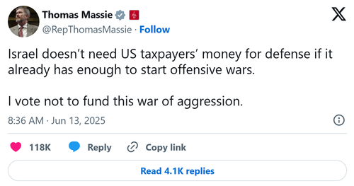 Rep. Massie was the only member of Congress to point out that the attack Israel launched on Friday was an offensive war of aggression. “Israel doesn’t need US taxpayers’ money for defense if it already has enough to start offensive wars.” His X post added, “I vote not to fund this war of aggression.”