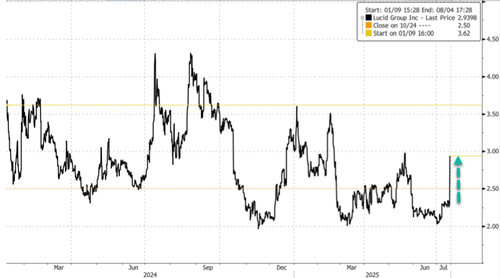 In markets, Lucid shares jumped as much as 62% in premarket trading in New York. As of Wednesday’s close, the stock was down 24% on the year. Shares remain heavily shorted—about 32% of the float, or roughly 395 million shares, are sold short, with a days-to-cover ratio around 2.9—leaving room for a potential squeeze during the cash session. Since the peak of the Covid-era mania in 2021, the stock is down 95% from its highs.