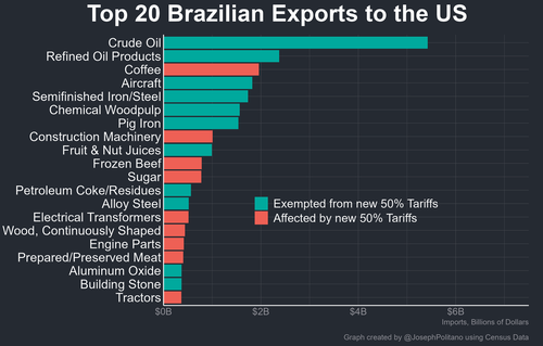 The 50% tariff on select Brazilian imports is the highest rate currently applied to any nation globally, and with tiny Switzerland coming in second, having been shocked by its 39% tariff rate, which are the highest tariffs in Europe.