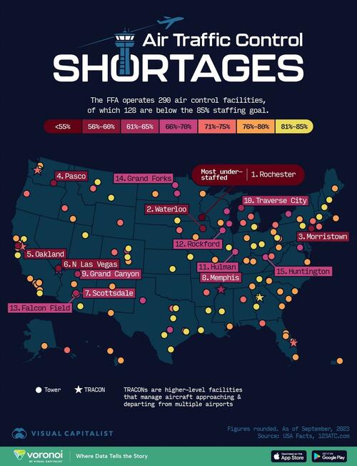 Visual Capitalist's Pallavi Rao maps out every single tower that is below the 2024-guideline staffing threshold (85%) per the latest available data current to September 2023, published by the FAA.