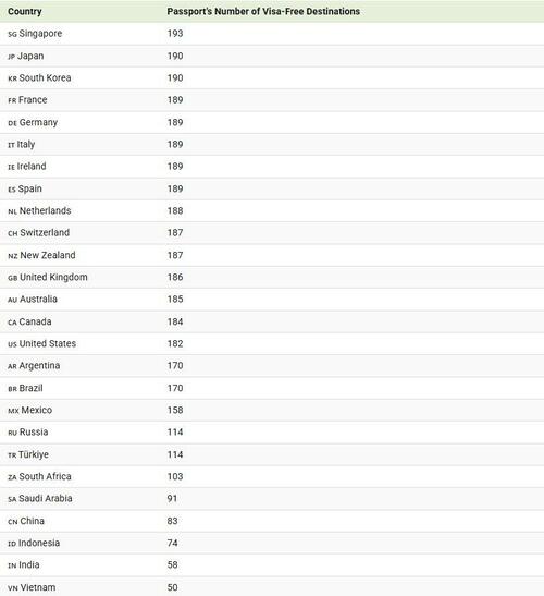 Notably, China (83), India (58), and Vietnam (50) sit near the bottom of the list, reflecting limited travel freedom despite their large populations and growing global roles.