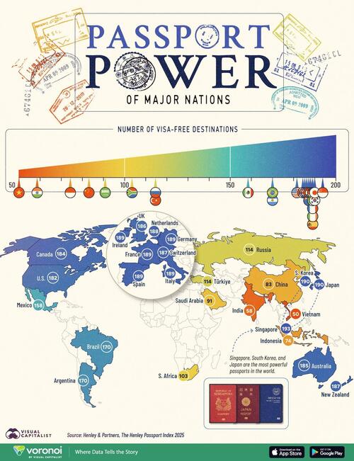 In the data table below, Visual Capitalist’s Niccolo Conte shows the full list of major countries and the number of visa-free access their passport provides: