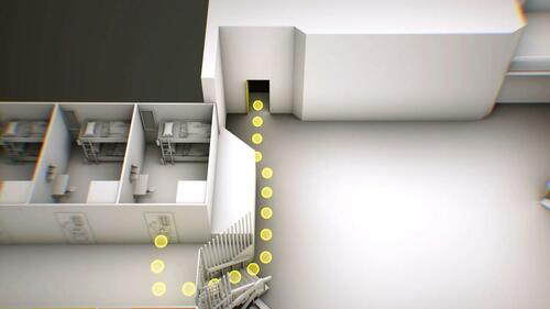 This illustration shows a path from the entrance to the Special Housing Unit common area to the stairs leading up to Epstein's cell. Only a narrow portion of the staircase could be seen in video released by federal officials. CBS News