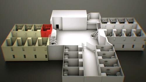 This illustration shows the location of Jeffrey Epstein's cell, in red. The common area of the Special Housing Unit is at the center. CBS News