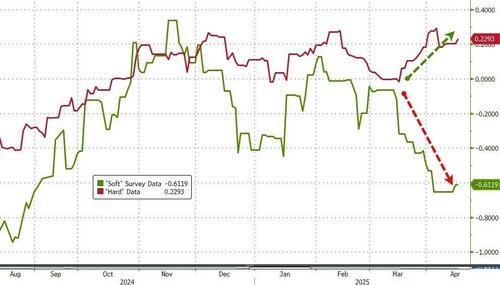 The drastically decoupled trend of hard data improvement and soft data dissolution continued this morning with US Manufacturing improving while NY Fed Business Leaders’ survey collapsing.