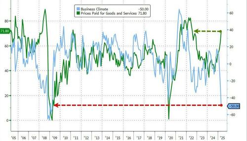 The business climate index dropped nine points to -50.0, its lowest level since Lehman; as expectations for Prices Paid soared top three year highs...