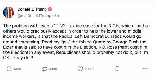 Trump says that the problem with ‘even a “TINY” tax increase for the RICH’ is that ‘Democrat Lunatics would go around screaming, “Read my lips,” the fabled Quote by George Bush the Elder that is said to have cost him the election,” – referring to then-candidate George H.W. Bush’s 1988 campaign promise not to raise taxes as president – which of course he did not keep, and was seen as a factor in his loss in the 1992 election.