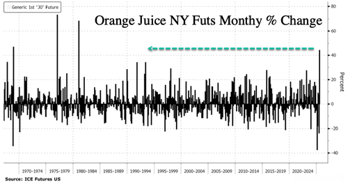 The most active contract jumped 8.655% to $3.1385 a pound on Monday, the highest since early March. Orange juice futures have been rallying since Trump’s trade warning letter to the South American country last week, stoking fears of renewed supply disruptions. Prices previously surged as high as $5 a pound in late 2024, as U.S. orange juice production fell to decade lows. Prices then crashed earlier this year.