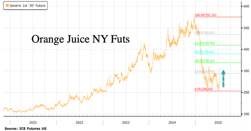 The most active contract jumped 8.655% to $3.1385 a pound on Monday, the highest since early March. Orange juice futures have been rallying since Trump’s trade warning letter to the South American country last week, stoking fears of renewed supply disruptions. Prices previously surged as high as $5 a pound in late 2024, as U.S. orange juice production fell to decade lows. Prices then crashed earlier this year.