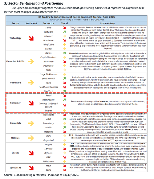 Goldman's take: "Sentiment remains very soft in Consumer, due to both sourcing and tariff concerns, while investors are also focused on the consumer slowdown theme."