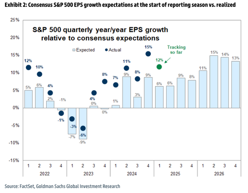 More broadly, with peak earnings season now behind us, Goldman Chief Equity Strategist David Kostin told clients Friday that results have held up relatively well: