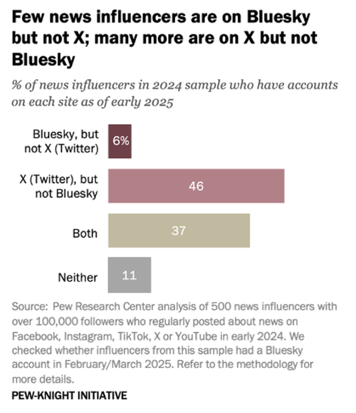 And most of these news influencers with a Bluesky account also have an X account. Only 6% of the influencers we studied have a Bluesky account but not an X account, while 37% have both. The largest share (46%) have an X account but not a Bluesky account.
