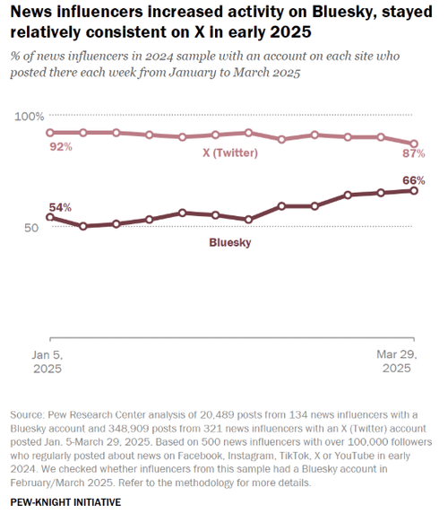 Pew also noted that most influencers continue to post regularly on X rather than on Bluesky.