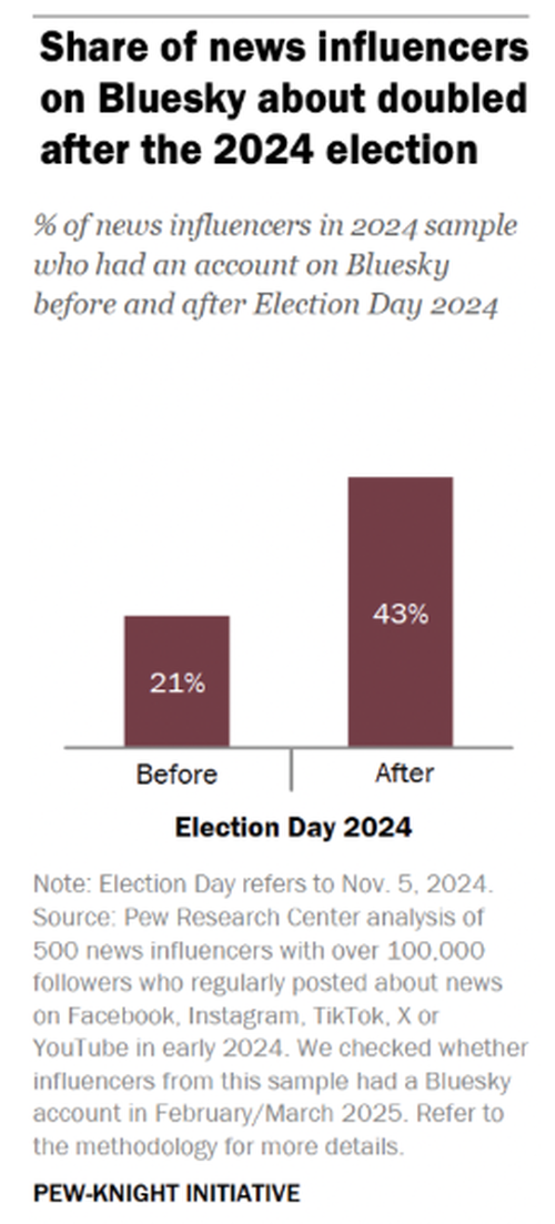 A new Pew Research Center analysis of 500 top news influencers (each with over 100,000 followers) shows that Bluesky's adoption surged after the 2024 presidential election, rising from 21% to 43% by March 2025. Nearly half of the Bluesky accounts were created after the election, with a sizeable spike in the final weeks of November.