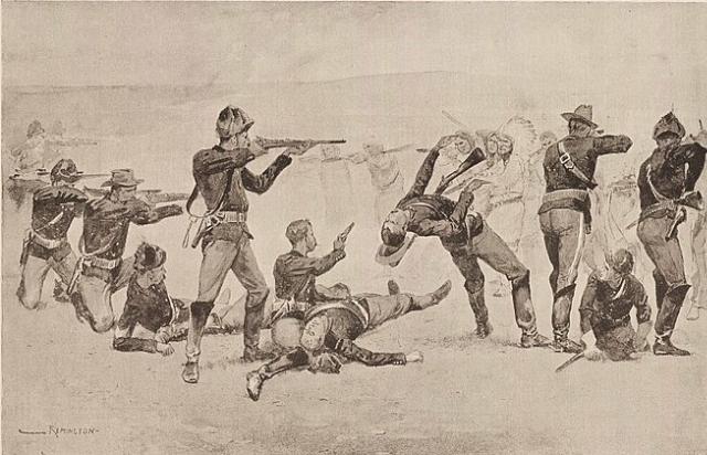 Image: Frederic Remington’s take on “The opening of the fight at Wounded Knee” (1891). Public domain.