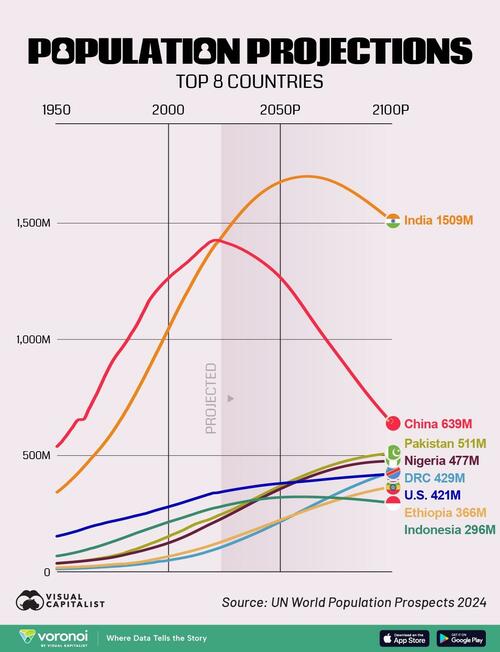 Using the latest data from the UN’s 2024 World Population Prospects, this infographic, via Visual Capitalist's Marcus Lu, visualizes how the world’s most populous countries are expected to change by 2100.