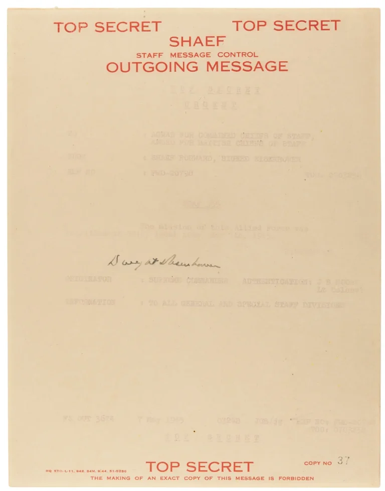 The first, expected to fetch over $30,000, was described by RR Auction: “At 2:41 AM on May 7, 1945, [German Colonel General Alfred] Jodl signed the Instrument of Unconditional Surrender in Reims, France. General Dwight D. Eisenhower announced the moment with a now-iconic eleven-word message: ‘The mission of this Allied Force was fulfilled at 0241, local time, May 7th, 1945.’”