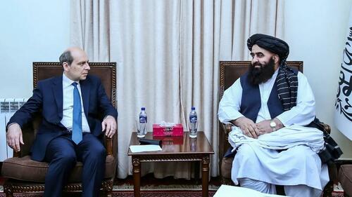 Russian amb. Dmitry Zhirnov (L) meets with Amir Khan Muttaqi, Afghanistan's Foreign Minister, in Kabul on Thursday. Afghanistan Ministry of Foreign Affairs/AFP.