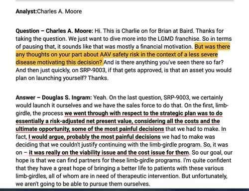 Multiple biotech analysts and traders online, including STAT's Adam Feuerstein, have pointed out that when CEO Doug Ingram was asked if safety played any role in the decision to cut the Limb-Girdle gene therapy programs on Wednesday, he avoided the question...and what appears to also be the answer.