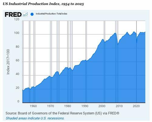 To wit, the US industrial production index—which measures the sum of manufacturing, energy, mining, and utility output—marched straight uphill at a 3.3% annual rate between 1954 and 2007.