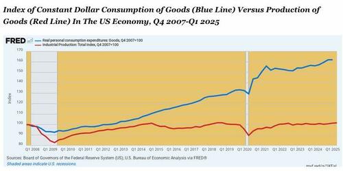 Obviously, the yawning gap got filled by imports. On the margin, therefore, the growth of goods consumption during the last 17 years was based on imports financed by massive current account deficits.