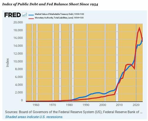 Thus, between 1954 and 2007, US Treasury debt outstanding grew by 6.5% per annum, while the Fed’s balance sheet expanded by 5.6% per year. During the last 17 years, by contrast, the public debt rose by 10.7% per year, and the Fed’s balance sheet grew by 13.3% per year.