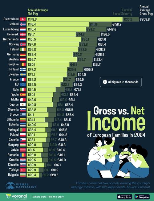 This visualization, via Visual Capitalist's Pallavi Rao, ranks gross and net earnings for dual-income European families with two dependents, and quantifies the impact of taxes and social contributions made in 2024.