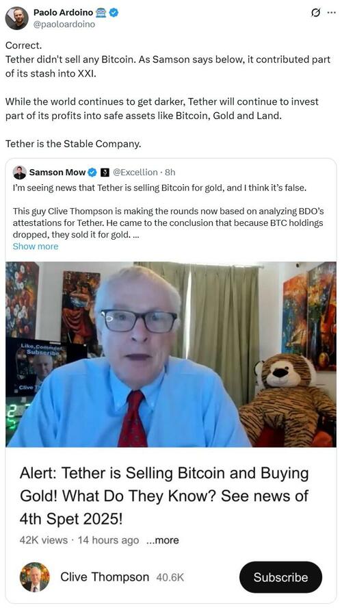 In a Sunday post on X, Ardoino said the company “didn’t sell any Bitcoin,” and reaffirmed its strategy of allocating profits into assets like “Bitcoin, gold, and land.”