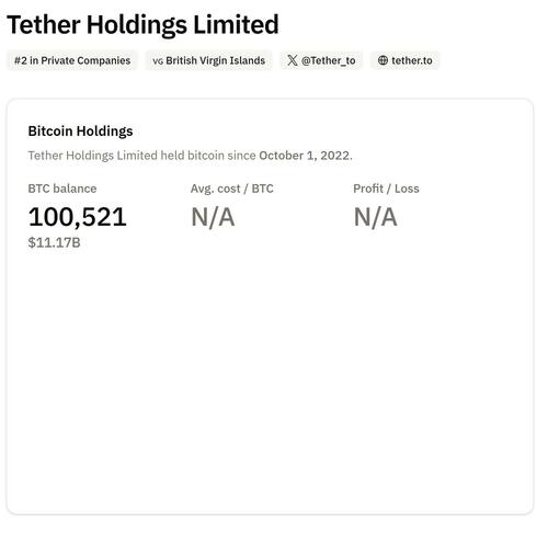 Tether, the issuer of the USDt stablecoin, holds over 100,521 BTC, worth around $11.17 billion, according to data from BitcoinTreasuries.NET.