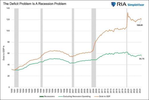 Note that it is at the same level today as it was in 2021. Similarly, before the pandemic, it had been relatively flat for seven years. This highlights that the deficit problem we have today was exacerbated by recession-prompted fiscal stimulus and the temporary decline in GDP.