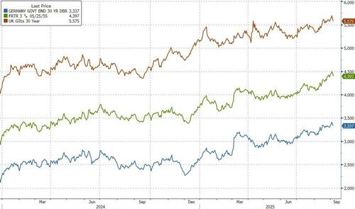 Accordingly, the soft JOLTS data triggered some USD depreciation, as rates across the yield curve fell. The decline in 30y Treasury yields from 5% to 4.9% may also ease some of the pressures on global governments. The rise in ultra-long US rates was echoed in countries like Japan and the UK. The yield on 30y JGBs reached a record-high 3.29% on Wednesday, but the bonds are currently back off those lows. The 30y Gilt came within a whisker of 5.75%, before retreating some 15bp. And although investors remain cautious amidst concerns about debt sustainability and rising global yields, Japan’s 30-year bond auction concluded today without major hiccups.
