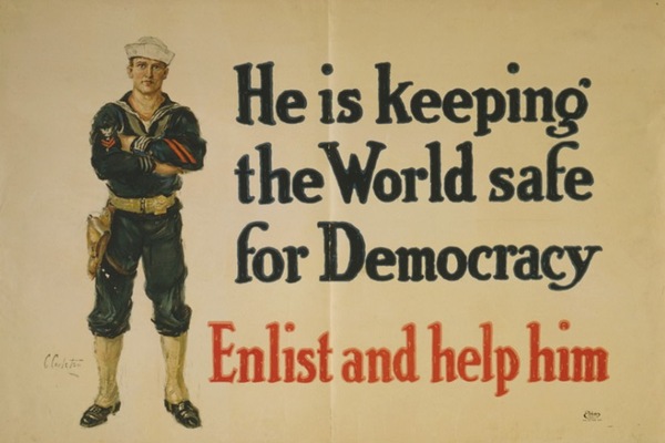 World War I poster with Wilson’s making the “world safe for Democracy” slogan. Public domain.