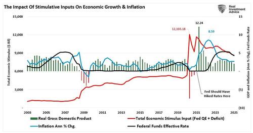 However, the Fed’s mistake wasn’t the “transitory” label—it was the Fed’s late response to raising interest rates and halting quantitative easing. As shown, the combined impact of the massive surge in the Government’s deficit spending (stimulus checks and infrastructure bills) and the Fed’s $120 billion monthly “quantitative easing” campaign caused a massive jump in economic growth and inflation. However, instead of cutting back on stimulus when the economy rebounded, the Fed’s mistake was keeping its “foot on the gas” for too long. These delays allowed the inflationary fire to burn hotter and longer than necessary, exacerbated by an overlooked driver: excessive government spending.