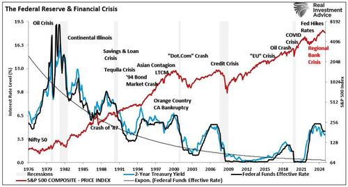 The historical shortcomings of the Fed’s actions, repeated policy mistakes, and flawed outlooks are clearly evident. The Fed hikes rates, creates an economic or credit-related event, and then cuts rates to fix it.