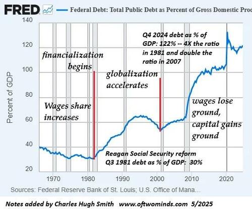 As the Federal-debt-GDP charts illustrates, Federal debt rose faster than GDP as financialization hollowed out the US economy. The acceleration of globalization from 2001 advanced this hollowing out.