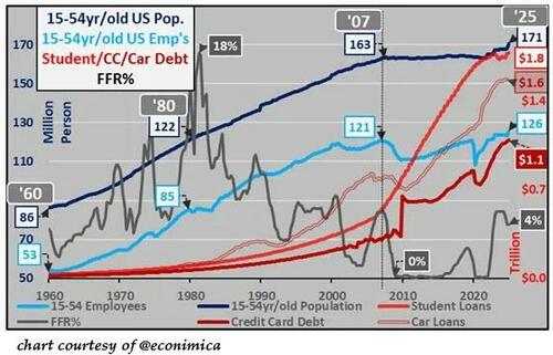 Note how debt serviced by younger generations exploded higher from 2008 while the population and workforce made only marginal gains.